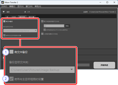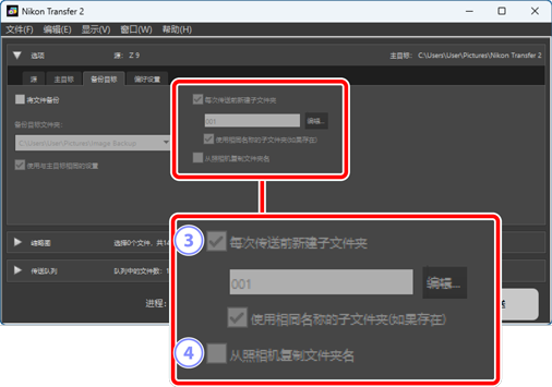 - 将照片复制至为 [备份目标文件夹] 所选的文件夹中,其中使用照相机内所用的文件夹层次和文件夹名称。
