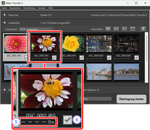 Bilder im Dual-Format RAW (NEF/NRW) + JPEG und RAW (NEF) + HEIF werden durch ein einziges Indexbild dargestellt. Sowohl die RAW- als auch die JPEG- bzw. HEIF-Dateien werden beim Übertragen auf den Computer heruntergeladen.