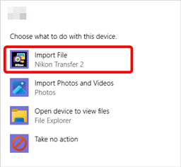 In this event, click the dialog and then click [Import File/Nikon Transfer 2] to select Nikon Transfer 2. Nikon Transfer 2 will launch automatically the next time the computer detects the camera or its memory card.