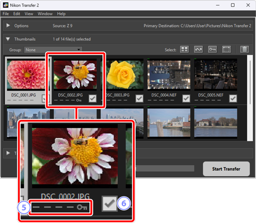 This pane lists thumbnail images showing the pictures on the camera or memory card. Pictures currently selected for download are indicated by check marks; turn the check marks on or off to choose pictures for download. At default settings, all pictures are selected. Information such as image attributes and transfer status is displayed on each thumbnail. Thumbnails can be filtered by category.
