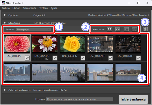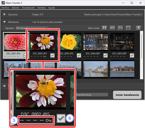 Las fotografías en formato dual RAW (NEF/NRW) + JPEG y RAW (NEF) + HEIF se representan mediante un sola miniatura. Tanto las copias RAW como las JPEG o HEIF se descargarán en el ordenador durante la transferencia.