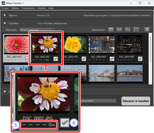 Les photos à double format RAW (NEF/NRW) + JPEG et RAW (NEF) + HEIF sont représentées par une seule vignette. Les deux copies RAW et JPEG ou HEIF seront téléchargées vers l’ordinateur pendant le transfert.