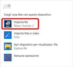 In tal caso, fare clic sulla finestra di dialogo e quindi fare clic su [Importa file/Nikon Transfer 2] per selezionare Nikon Transfer 2. Nikon Transfer 2 verrà avviato automaticamente la volta successiva in cui il computer rileva la fotocamera o la relativa card di memoria.
