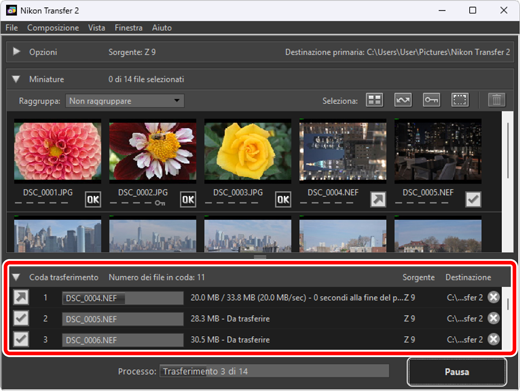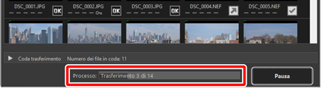 Lo stato di scaricamento corrente viene visualizzato nella barra [Processo] come numero di immagini scaricate rispetto al numero totale di file nella coda. Per sospendere lo scaricamento, fare clic su [Pausa].