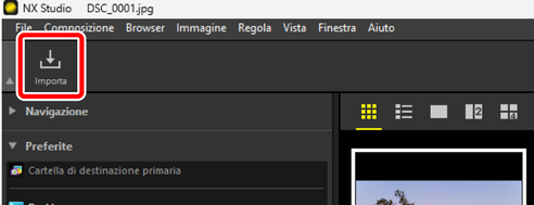 Una volta scaricate, le immagini possono essere visualizzate in NX Studio. NX Studio può essere utilizzato per sfogliare grandi numeri di immagini senza problemi e per mettere i tocchi finali sulle immagini migliorandole in diversi modi o regolando le opzioni di elaborazione RAW. Per informazioni sull'utilizzo di NX Studio, vedere l'Aiuto in linea di NX Studio.