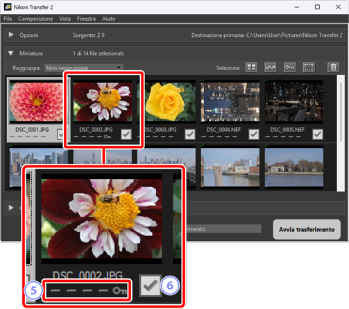 Le immagini fisse a doppio formato RAW (NEF/NRW) + JPEG e le immagini fisse RAW (NEF) + HEIF sono rappresentate da una singola miniatura. Sia le copie RAW sia le copie JPEG o HEIF saranno scaricate sul computer durante il trasferimento.