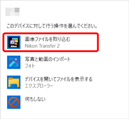 その場合、表示されたダイアログをクリックしてから、[画像ファイルを取り込む-Nikon Transfer 2]を選びます。次回以降同じカメラまたはメモリーカードをパソコンに接続すると、Nikon Transfer 2が自動で起動します。