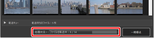 [処理状況]バーには「転送済みの枚数/転送する画像の総枚数」と現在の転送状況が表示されます。[一時停止]ボタンをクリックすると、転送を中断できます。