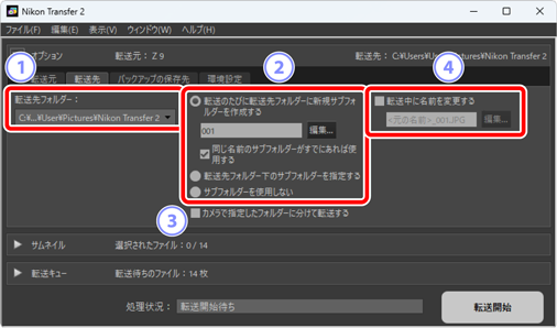 画像の転送先フォルダーを設定できます。サブフォルダーの設定や、転送時にファイル名を変更する設定も行えます。