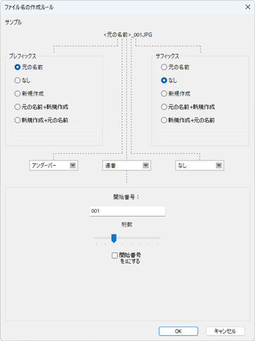 - 設定中はダイアログ上部の[サンプル]に、作成するファイル名のサンプルが表示されます。サンプルは項目の設定内容に連動して表示されます。