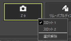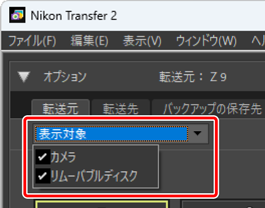 [表示対象]プルダウンメニューで、[転送元]パネルに表示するデバイスの種類を[カメラ]と[リムーバブルディスク]から選べます。チェックを入れたデバイスがデバイスボタンとして表示されます。