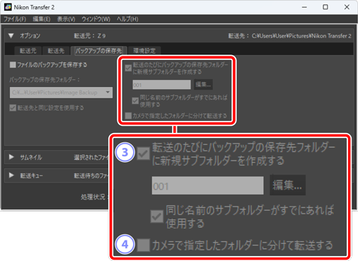 - カメラで使用しているフォルダー名をそのまま使用してサブフォルダーを作成し、[バックアップの保存先フォルダー]で指定したフォルダーに転送します。