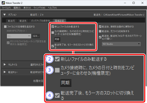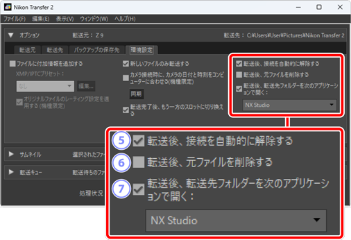 - チェックを入れると、プルダウンメニューで選んだソフトウェアが画像転送完了後に起動します。