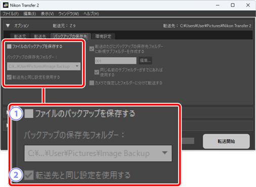 画像の転送と同時に、転送先フォルダーとは別のフォルダーにバックアップを保存できます。