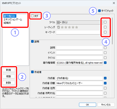 - XMP/IPTCプリセットの新規作成および選択したXMP/IPTCプリセットの複製/削除が行なえます。