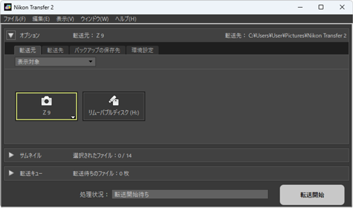 画像転送元のデバイス選択や、転送先フォルダーの指定などの設定を行えます。[オプション]エリアには[転送元]、[転送先]、[バックアップの保存先]、[環境設定]パネルがあります。