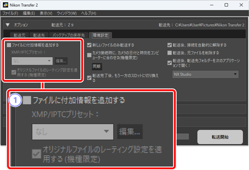 チェックを入れると、XMP/IPTC情報を付加しながら画像を転送します。