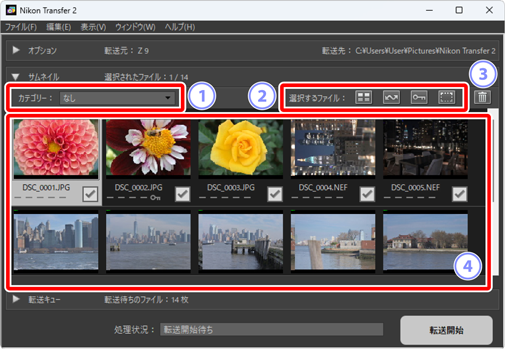 画像転送元のカメラやメモリーカードに記録されている画像のサムネイルを表示します。チェックが入っている画像がパソコンに転送され、チェック状態を切り替えて転送する画像を選べます。初期設定ではすべての画像にチェックが入っています。画像のサムネイルには画像の属性や転送状態が表示されています。表示するサムネイルはカテゴリーで絞り込むこともできます。