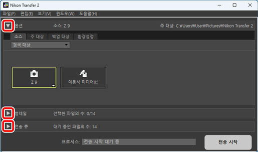 - [소스] 탭 및 [주 대상] 탭을 사용하여 화상을 다운로드할 장치를 선택하고 다운로드한 화상을 저장할 컴퓨터 폴더를 선택합니다. [백업 대상] 탭 및 [환경설정] 탭에서 다운로드하는 동안 백업을 만들고 다운로드 설정을 조정할 수 있습니다(0 [옵션] 창).