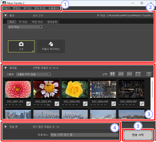 Nikon Transfer 2 윈도우 부분이 아래에 표시됩니다.
