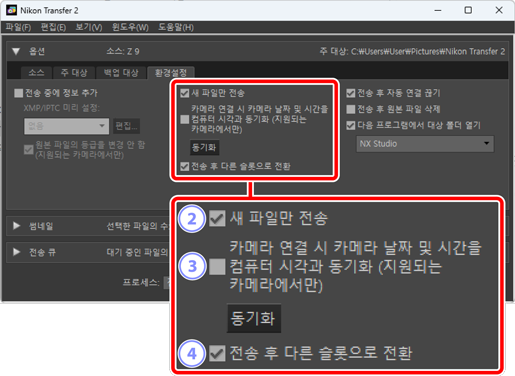 이 옵션을 선택하면 다운로드가 완료될 때 카메라에 삽입되지 않은 모든 메모리 카드의 연결이 자동 종료됩니다.