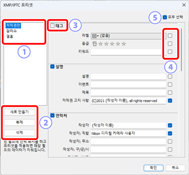 다음 옵션은 XMP/IPTC 미리 설정을 관리하는 데 사용할 수 있습니다.