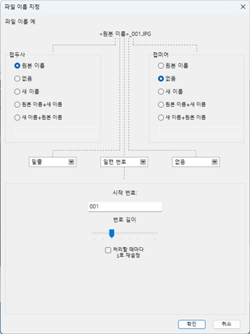 이름 지정 옵션 [일련 번호], [전송 날짜], [전송 날짜 및 시간], [촬영 날짜]에서 선택합니다. 선택한 옵션이 이름 중간 부분을 구성합니다. 원하는 경우 접두사와 접미사를 추가할 수 있습니다.