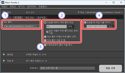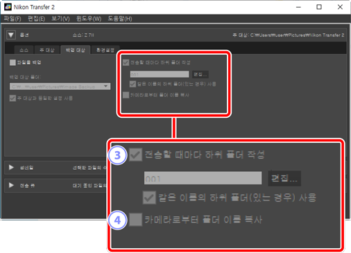 - [대상 폴더 아래의 하위 폴더 선택]: [대상 폴더]에서 선택한 폴더 내 하위 폴더에 화상을 다운로드합니다. 전송 옵션 상단 영역에서 [주 대상] 경로 끝에 하위 폴더 이름을 입력합니다. 하위 폴더를 선택하지 않은 경우 선택한 이름 아래에 새 하위 폴더가 만들어집니다. 풀다운 메뉴에서 이전에 사용한 하위 폴더를 선택할 수도 있습니다.