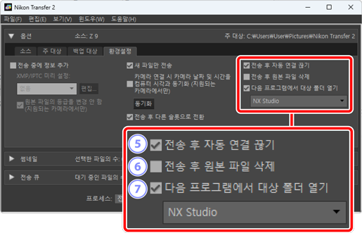 - 이 옵션을 선택하여 다운로드가 완료될 때 카메라 또는 메모리 카드에서 파일이 자동으로 삭제됩니다. 다운로드에 포함되지 않거나 카메라에 보호 표시된 파일은 삭제되지 않습니다.