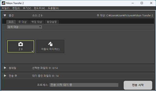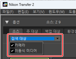소스 장치(화상을 다운로드할 장치)를 선택하고 대상 폴더를 선택하는 등 다양한 작업을 수행합니다. [옵션] 창에는 [소스], [주 대상], [백업 대상] 및 [환경설정] 탭이 포함됩니다.