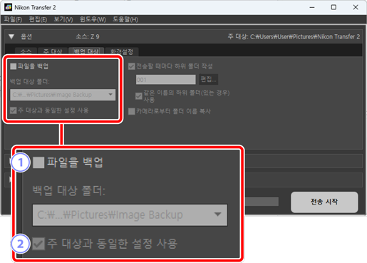 - 다운로드하는 동안 이 옵션을 선택하여 화상의 백업 사본을 만듭니다. 화상을 [백업 대상 폴더]에서 선택한 폴더에 복사합니다. 풀다운 메뉴에서 이전에 사용한 폴더를 선택하거나 [찾아보기]를 클릭하고 새 폴더를 선택합니다.