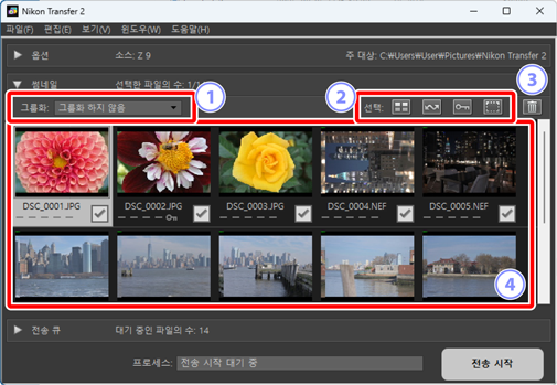 이 창에서 카메라 또는 메모리 카드에 있는 화상을 표시하는 썸네일 이미지가 나열됩니다. 다운로드하도록 현재 선택된 화상에 선택 표시가 나타납니다. 선택 표시를 껐다가 켜서 다운로드할 화상을 선택합니다. 기본 설정에서는 모든 화상이 선택됩니다. 이미지 속성및 전송 상태와 같은 정보가 각 썸네일에 표시됩니다. 썸네일을 속성에 따라 필터링할 수 있습니다.