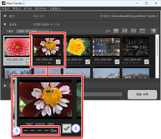 촬영할 때에 동시 기록된 RAW 화상(NEF, NRW)과 JPEG/HEIF 화상은 하나의 썸네일로서 표시합니다. 전송할 때는, RAW 화상과 JPEG/HEIF 화상의 양쪽 모두가 전송됩니다.