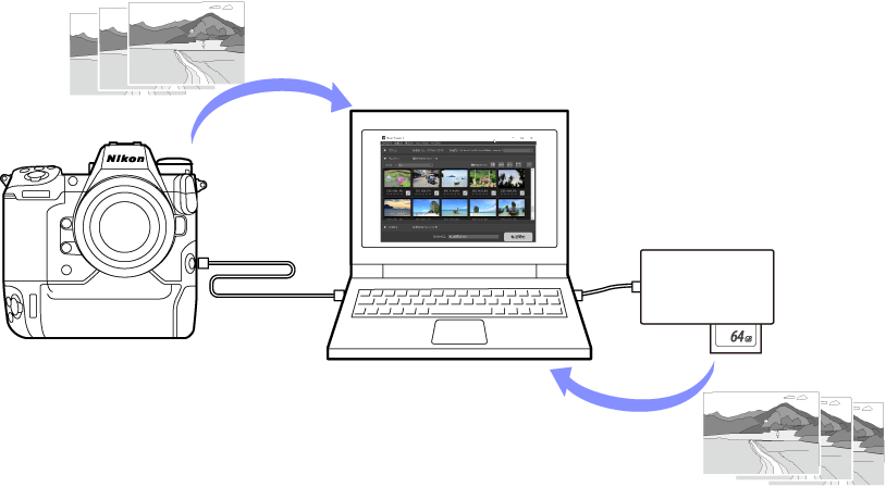 Gebruik Nikon Transfer 2 om fotoʼs van de camera naar een geselecteerde map op uw computer te kopiëren. De foto’s op de geheugenkaart van de camera kunnen worden weergegeven door de camera op de computer aan te sluiten of door de kaart in de geheugenkaartsleuf van de computer (indien beschikbaar) of een kaartlezer van een ander merk te plaatsen. U kunt vervolgens foto’s kiezen om over te spelen of alle foto’s downloaden van de geheugenkaart.