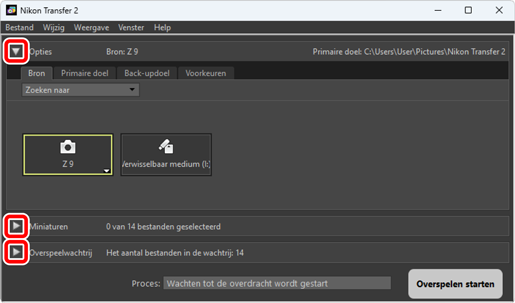 Het Nikon Transfer 2-venster