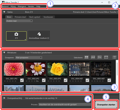 De onderdelen van het Nikon Transfer 2-venster worden hieronder getoond.