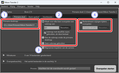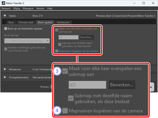 - [Geen submap gebruiken]: download foto’s rechtstreeks naar de map die geselecteerd is voor [Primaire doelmap] in plaats van naar een submap.