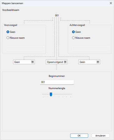 Kies uit de volgende naamgevingsopties: [Opeenvolgend nummer], [Overdrachtsdatum], [Overdrachtsdatum en -tijd] en [Opnamedatum]. De geselecteerde optie vormt het middelste gedeelte van de naam, waaraan voorvoegsels en achtervoegsels naar wens kunnen worden toegevoegd.