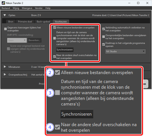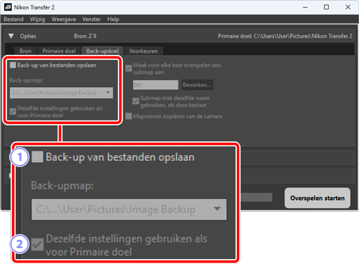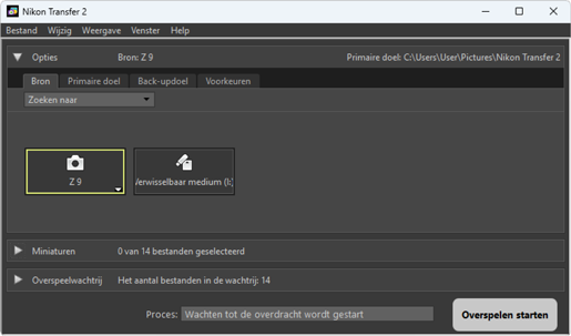 Voer een verscheidenheid aan taken uit, inclusief het selecteren van het bronapparaat (het apparaat waaruit de fotos worden gedownload) en het kiezen van een doelmap. Het [Opties]-paneel bevat de volgende tabbladen: [Bron], [Primaire doel], [Back-updoel] en [Voorkeuren].