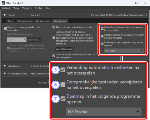 - Selecteer deze optie om bestanden automatisch van de camera of de geheugenkaart te verwijderen wanneer het downloaden is voltooid. Bestanden die niet zijn gedownload of die op de camera zijn gemarkeerd als beveiligd, worden niet verwijderd.