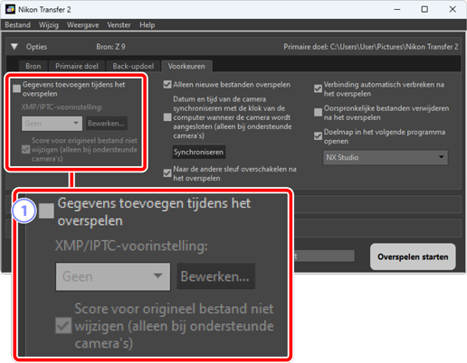 - [XMP/IPTC-voorinstelling]: kies een opgeslagen voorinstelling uit het vervolgkeuzemenu. Klik op [Bewerken] om XMP/IPTC-voorinstellingen te beheren (0 XMP/IPTC-voorinstellingen).