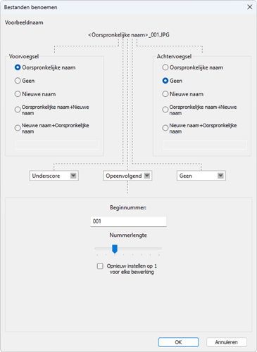 - Een voorbeeld van de namen die door de geselecteerde regels worden gegenereerd, verschijnt in het veld [Voorbeeldnaam] bovenaan het dialoogvenster. Het voorbeeld wordt automatisch bijgewerkt terwijl u de regels wijzigt.