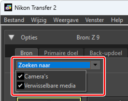 Gebruik het vervolgkeuzemenu [Zoeken naar] om de typen apparaten te kiezen die worden weergegeven op het tabblad [Bron] uit [Camera’s] en [Verwisselbare media]. Het tabblad bevat alleen knoppen voor apparaten van het geselecteerde type.