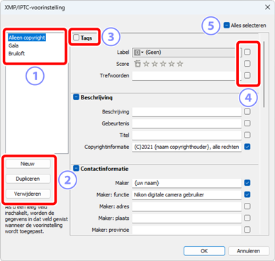 - Selecteer of hef de selectie op van alle items in de XMP/IPTC-voorinstelling.