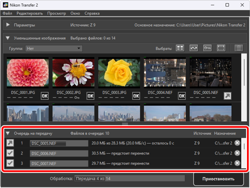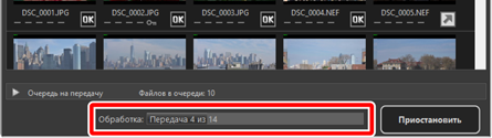 Текущий статус загрузки отображается в строке [Обработка] как количество загруженных снимков по сравнению с общим количеством файлов в очереди. Чтобы приостановить загрузку, щелкните [Приостановить].