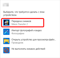 В этом случае щелкните диалоговое окно, а затем щелкните [Передача снимков Nikon Transfer 2], чтобы выбрать Nikon Transfer 2. Nikon Transfer 2 автоматически запустится в следующий раз, когда компьютер обнаружит фотокамеру или ее карту памяти.