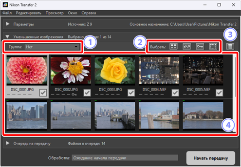 На этой панели перечислены уменьшенные изображения, представляющие снимки, хранящиеся в фотокамере или на карте памяти. Снимки, выбранные в данный момент для загрузки, отмечены флажками; установите или снимите флажки, чтобы выбрать снимки для загрузки. По умолчанию выбраны все снимки. На каждом уменьшенном изображении отображается такая информация, как атрибуты изображения и статус передачи. Уменьшенные изображения можно фильтровать по категориям.