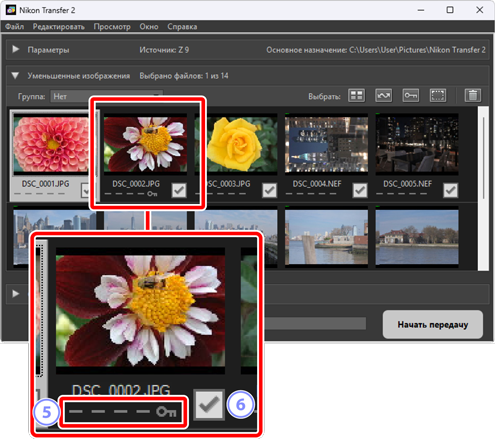 Двухформатные снимки RAW (NEF/NRW) + JPEG и RAW (NEF) + HEIF представлены одним уменьшенным изображением. Во время передачи на компьютер будут загружены копии как RAW, так и JPEG или HEIF.