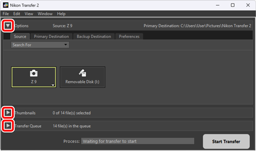 - Använd flikarna [Source (Källa)] och [Primary Destination (Primär destination)] för att välja den enhet från vilken bilder ska laddas ned och för att välja mappen på datorn där de nedladdade bilderna ska sparas. Du kan använda flikarna [Backup Destination (Säkerhetskopieringsdestination)] och [Preferences (Inställningar)] för att skapa säkerhetskopior under nedladdning och justera inställningarna för nedladdning (0 Fönstret [Options (Alternativ)]).