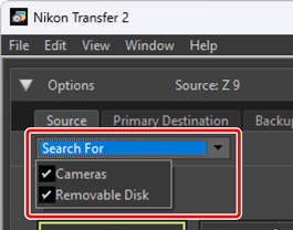 Använd gardinmenyn [Search for (Sök efter)] om du vill välja vilka enhetstyper som ska visas på fliken [Source (Källa)] bland [Cameras (Kameror)] och [Removable disk (Flyttbar enhet)]. Fliken listar då endast knappar för den valda typen av enheter.